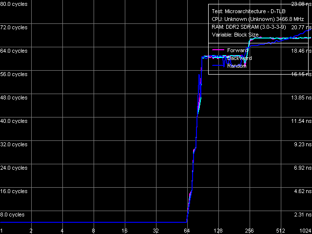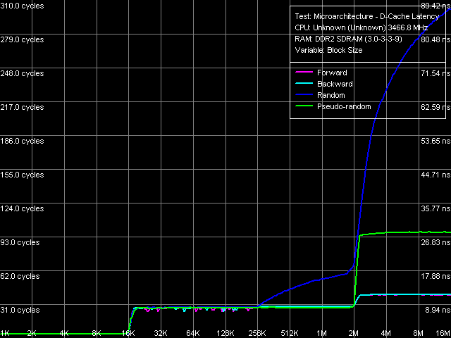 О чем это говорит? Разумеется, об истинной 5-тактной латентности L2-кэша (при 4-тактном L1) говорить было бы абсурдно скорее, можно говорить о реализации аппаратной предвыборки данных на уровне L2-кэша процессора! В пользу аппаратной предвыборки, которую, как известно, легко реализовать именно для линейного считывания данных, говорят «разгрузочные кривые», наблюдаемые именно при последовательном обходе. В остальных же случаях наблюдаем латентность L2-кэша «практически в чистом виде», как и во всех остальных ядрах семейства Prescott.