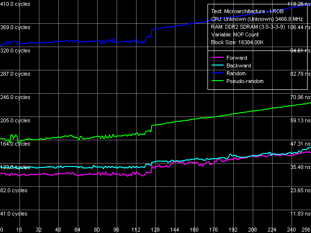Оценка глубины буфера переупорядочивания инструкций на Presler (рис. 11) дает картину, схожую с полученной в ходе тестов процессорного ядра Nocona степпинга D0. Перегиб наблюдается в области 120 NOP-ов, что весьма близкую к подлинному значению, заявленному для процессоров класса Pentium 4 Prescott (126). Разумно предложить, что такую же глубину I-ROB имеют и новые двухъядерные процессоры Pentium D/Extreme Edition 800-й и 900-й серий, основанные на ядрах Smithfield и Presler.