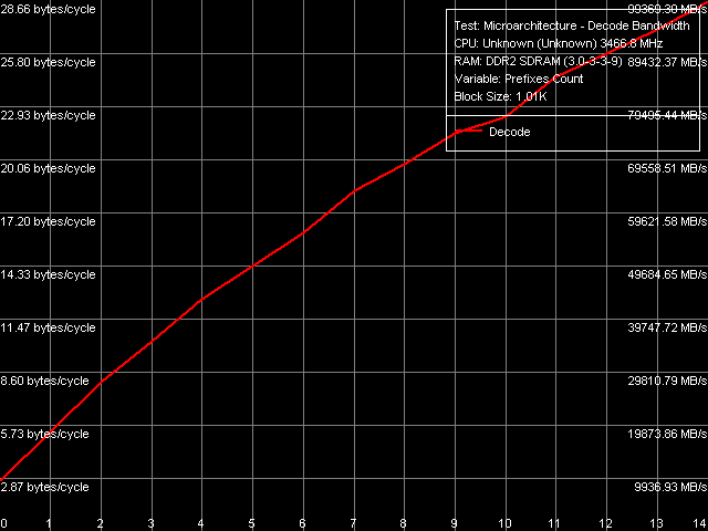Второе ощутимое изменение декодера ядер Prescott/Nocona с введением EM64T заключалось в снижении эффективности отбрасывания «бессмысленных» префиксов в тесте исполнения инструкций вида [0x66]nNOP, n = 0..14.