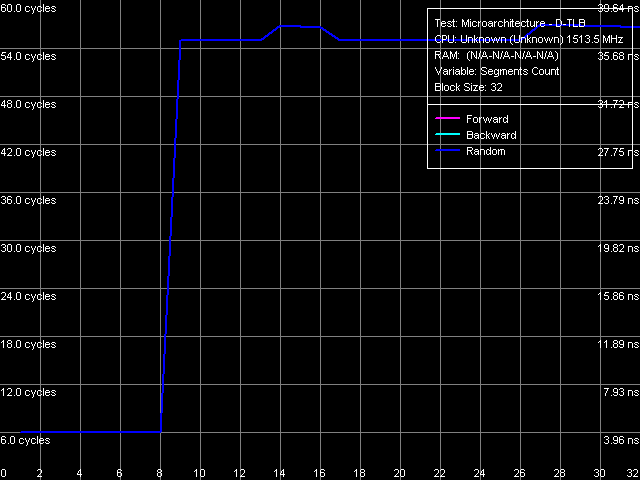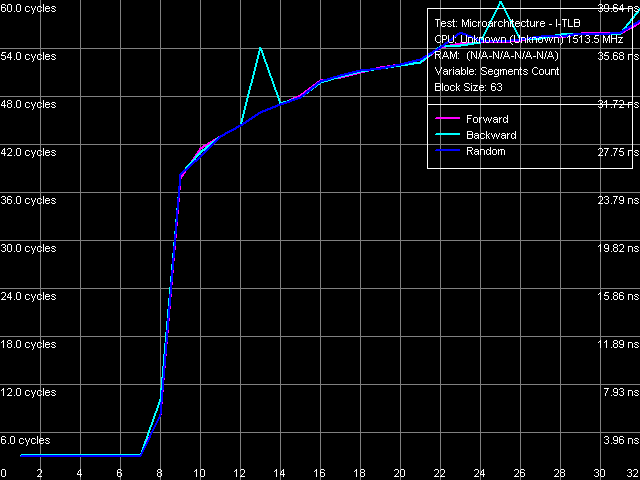 К сожалению, этот тест не дает однозначной картины по его результатам можно говорить об ассоциативности L1-кэша, равной четырем (область первого перегиба на графике), в то время как по мере дальнейшего увеличения числа сегментов достаточно четкой картины не наблюдается. Впрочем, это неудивительно ведь максимальное их количество в данном тесте ограничено 32 (при разработке теста никак не предполагалось появление процессоров с таким кэшем), тогда как вторая область перегиба в данном случае (эксклюзивная организация) должна наблюдаться при количестве сегментов, равному «суммарной ассоциативности» L1+L2 кэшей, т.е. 36. Что ж, нам пока остается лишь поверить в 32-way ассоциативность L2-кэша процессоров C7/C7-M, а в дальнейшем расширить функциональность нашего тестового пакета.