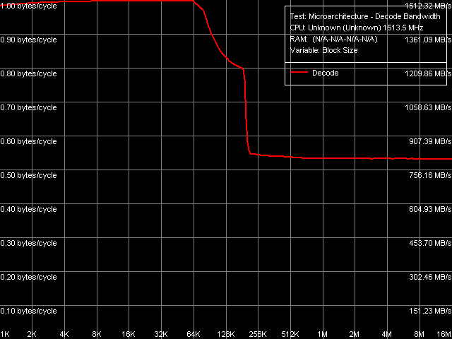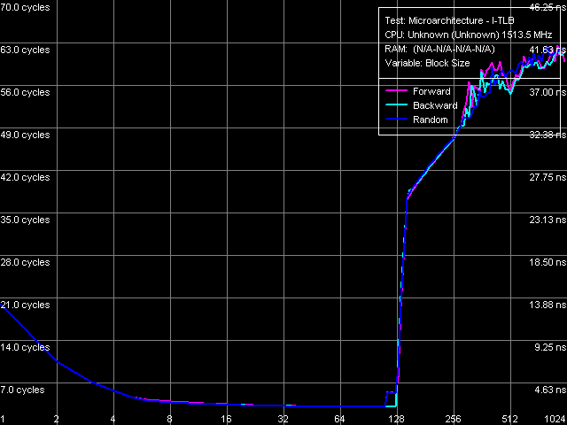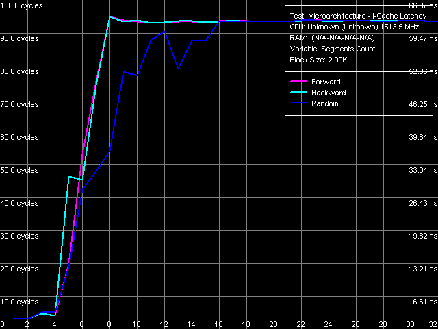 А именно, здесь отсутствует четкая область, соответствующая исполнению инструкций из L2-кэша. Это не значит, что L2-кэш этого процессора «не работает» на случай кэширования кода (вместо данных), т.к. скорость декодирования/исполнения в области 64-192 КБ все-таки отличается от таковой при выходе за пределы суммарного объема L1I и L2-кэша.