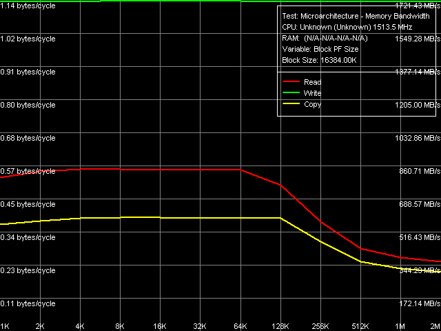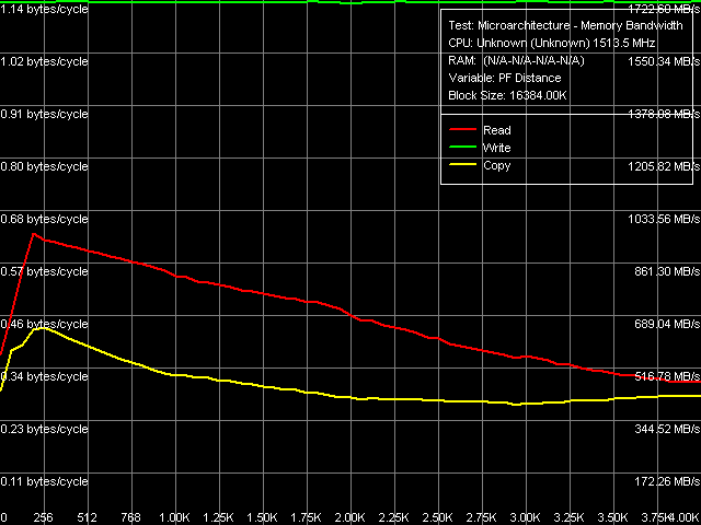 | Чтение, MMX Чтение, SSE Чтение, MMX, SW Prefetch Чтение, SSE, SW Prefetch Чтение, MMX, Block Prefetch 1 Чтение, SSE, Block Prefetch 1 Чтение, MMX, Block Prefetch 2 Чтение, SSE, Block Prefetch 2 Чтение строк кэша, прямое Чтение строк кэша, обратное | 439 (20.6 %) 433 (20.3 %) 334 (15.7 %) 485 (22.7 %) 524 (24.6 %) 537 (25.2 %) 539 (25.3 %) 609 (28.6 %) 660 (31.0 %) 660 (31.0 %) | 525 (19.7 %) 564 (21.1 %) 911 (34.2 %) 962 (36.1 %) 843 (31.6 %) 844 (31.6 %) 785 (29.4 %) 839 (31.5 %) 920 (34.5 %) 910 (34.1 %) |