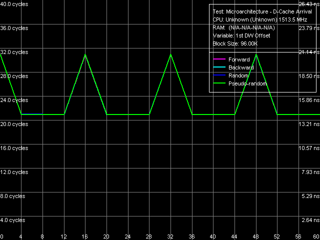 В этом тесте переменной является смещение первого запрашиваемого элемента относительно начала строки (от 0 до 60 байт), в то время как второй запрашиваемый элемент всегда смещен относительно первого на -4 байта (за исключением начальной точки, когда смещение оказывается равным -4 + 64 = +60 байт, вследствие необходимости соблюдения условия попадания обоих элементов в одну и ту же строку кэша).