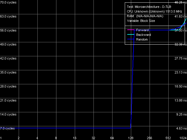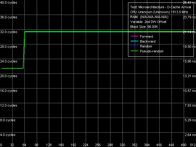 Напомним, что в этом тесте происходит считывание двух элементов из одной и той же строки кэша, второй элемент отстоит от первого (начала строки) на заданную величину (от 4 до 60 байт). Данный тест показывает, что за 6 тактов доступа в L1-кэш, из L2-кэша процессора успевают прибыть лишь первые 48 байт (с 0-го по 47-й включительно), в то время как запрос последующего 48-го байта сопровождается ощутимым увеличением задержек. Это означает, что скорость передачи данных действительно составляет 48/6 = 8 байт/такт, т.е. разрядность шины равна 64 бит.