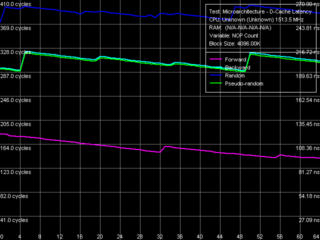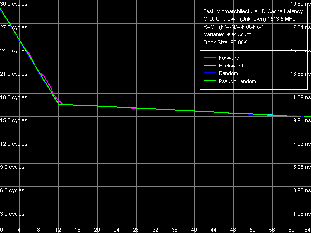 Картина разгрузки шины L2-RAM (рис. 9) напоминает таковую для процессоров семейства AMD K7, в которых аппаратная предвыборка данных также реализована только для прямого последовательного обхода и обладает сравнительно малой эффективностью «разгрузочная кривая» спадает очень плавно и не достигает своего минимума даже при вставке 64 NOP-ов. Минимальное значение латентности оперативной памяти в этой точке составляет 94 нс. В случае обратного, псевдослучайного и случайного обхода кривые имеют типичный «зубчатый» вид с шагом в 15 NOP-ов, соответствующих коэффициенту умножения частоты системной шины процессора (100 МГц x 15 = 1.5 ГГц). Как это обычно и бывает, минимальные латентности в этих режимах не сильно отличаются от своих «средних» значений.
