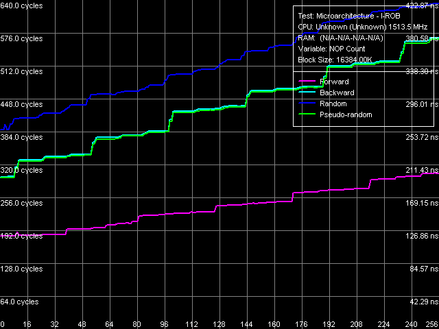 Весьма интересную картину ядро Esther показывает в тесте буфера переупорядочивания инструкций (рис. 17), принцип работы которого следующий: запускается одна простая, но долго исполняемая инструкция операция зависимой загрузки последующей строки данных из памяти, mov eax, [eax], а сразу вслед за ней серия очень простых, не зависящих от нее операций (nop). В идеализированном случае, как только время исполнения такой связки начинает зависеть от количества NOP-ов, можно считать, что объем буфера I-ROB исчерпан.
