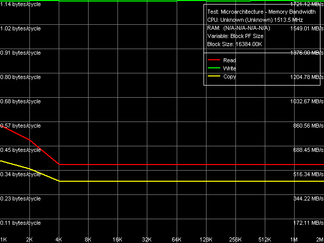Несмотря на использование более скоростной, 100-МГц (400-МГц Quad-Pumped) системной шины V4, обладающей теоретической пропускной способностью 3.2 ГБ/с, а также более скоростной памяти DDR-333 с предельной пропускной способностью 2.67 ГБ/с, реальная пропускная способность памяти при тотальном чтении данных (без оптимизации) осталась на весьма скромном уровне порядка 0.56 ГБ/с. В то же время, приятно отметить, что в этой платформе значительно возросла пропускная способность памяти при операциях записи данных в последнюю до величин порядка 0.62 ГБ/с, что в 3-4 раза выше по сравнению с ранней платформой с процессором VIA Antaur.