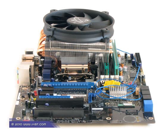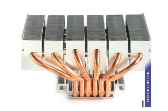 Конструктивные особенности (радиатор). «Рабочее тело» кулера образовано комбинацией медного теплосъемника 52х52х6 мм, вспомогательного алюминиевого радиатора 76х50х30 мм, шести медных тепловых трубок диаметра 6 мм и трех секций алюминиевого оребрения (53 пластины в каждой секции, общая площадь поверхности теплообмена порядка 6500 см2).