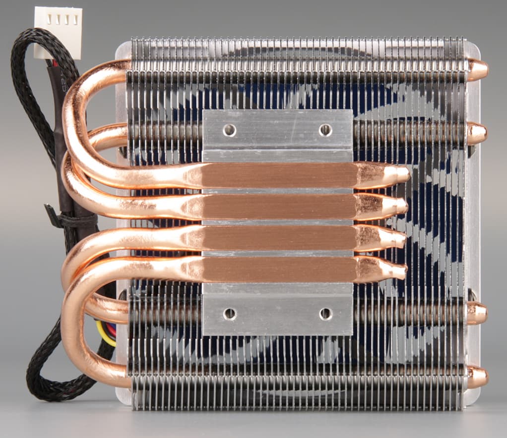 Кулер оснащен вынесенным радиатором, к которому тепло от подошвы передается по четырем тепловым трубкам. В принципе, ребра радиатора прилегают к подошве без или с минимальным зазором, но тепловым контактом в данном месте можно пренебречь. Трубки, разумеется, медные. У подошвы теплосъемника трубки сплющены и впрессованы в толстую алюминиевую пластину, снаружи анодированную.