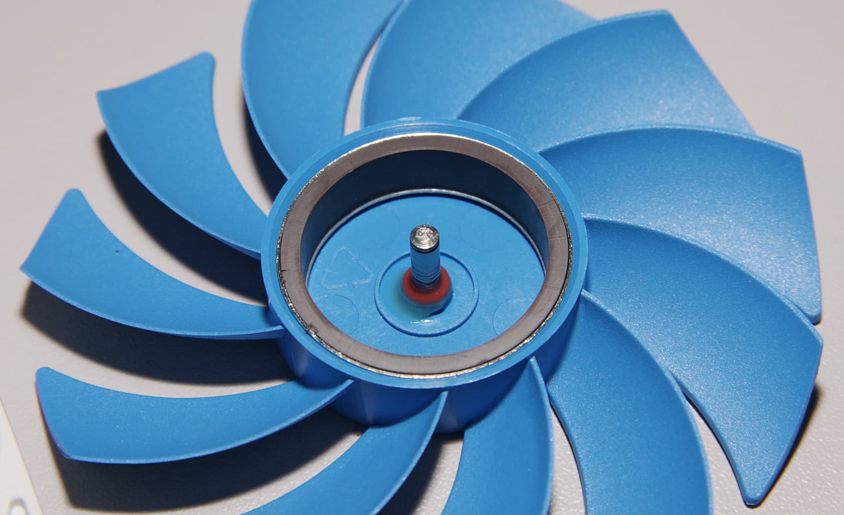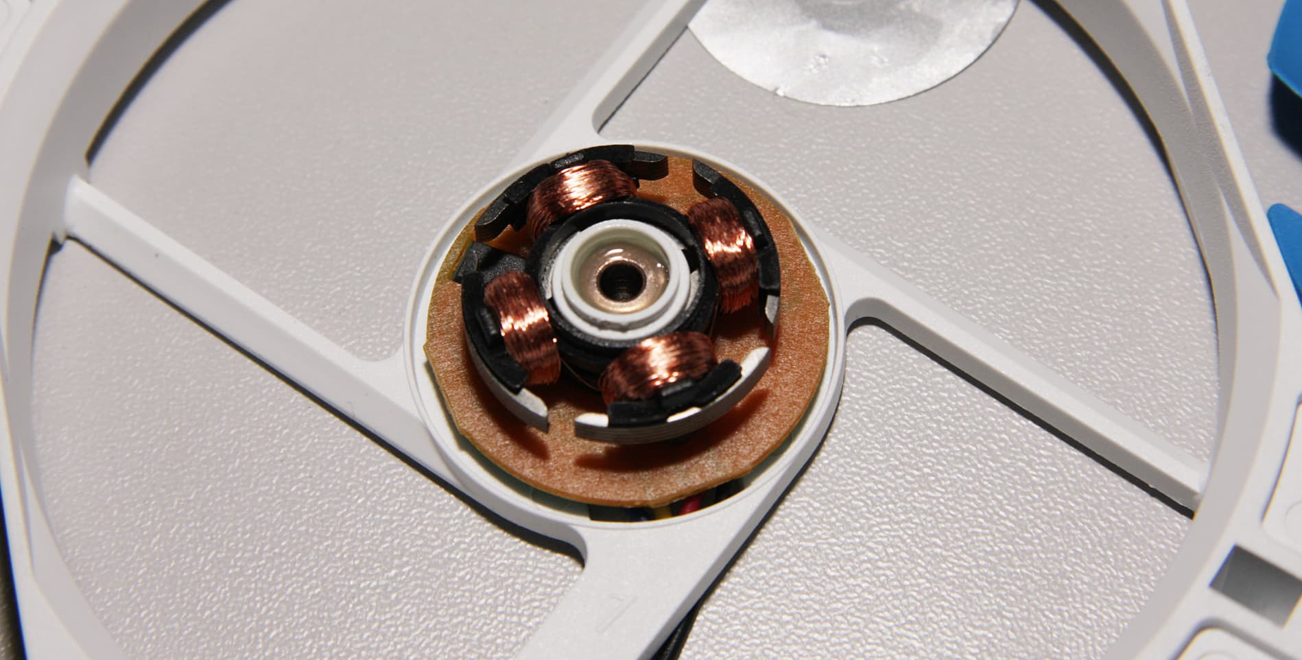 Сняв наклейку, резиновую заглушку и фиксирующую разрезную шайбу мы смогли разобрать вентилятор (на всякий случай это мы сделали уже после завершения всех тестов). В данном вентиляторе используется подшипник скольжения, образованный втулкой из медного сплава и стальной осью на крыльчатке, смазка имеет среднюю консистенцию.