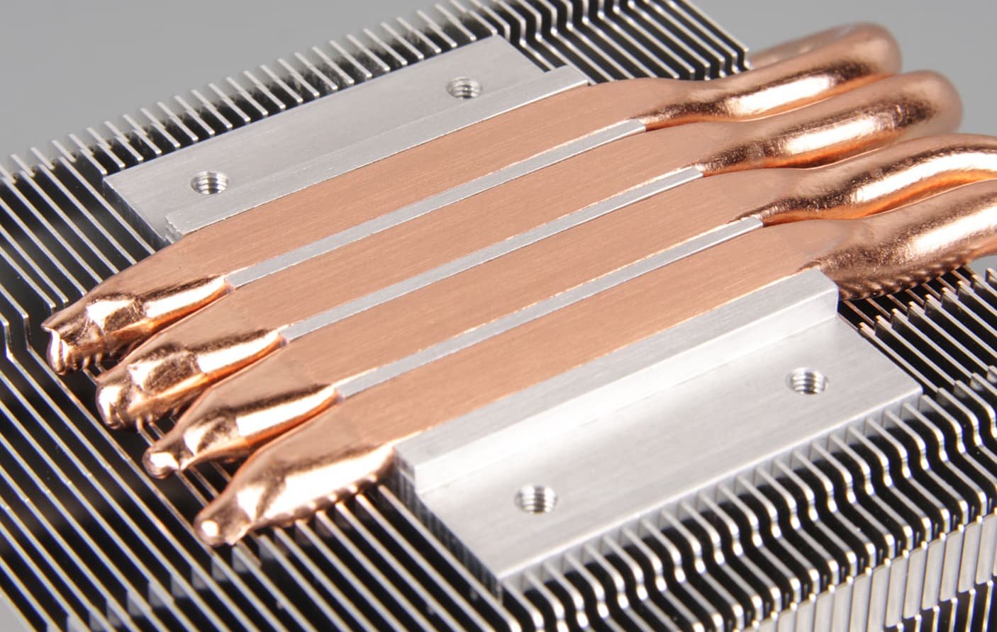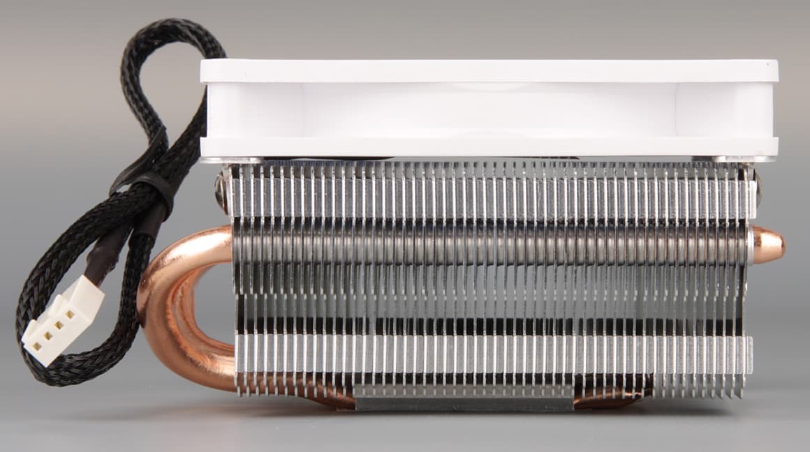 Радиатор представляет собой стопку алюминиевых пластин, плотно насаженных на тепловые трубки.