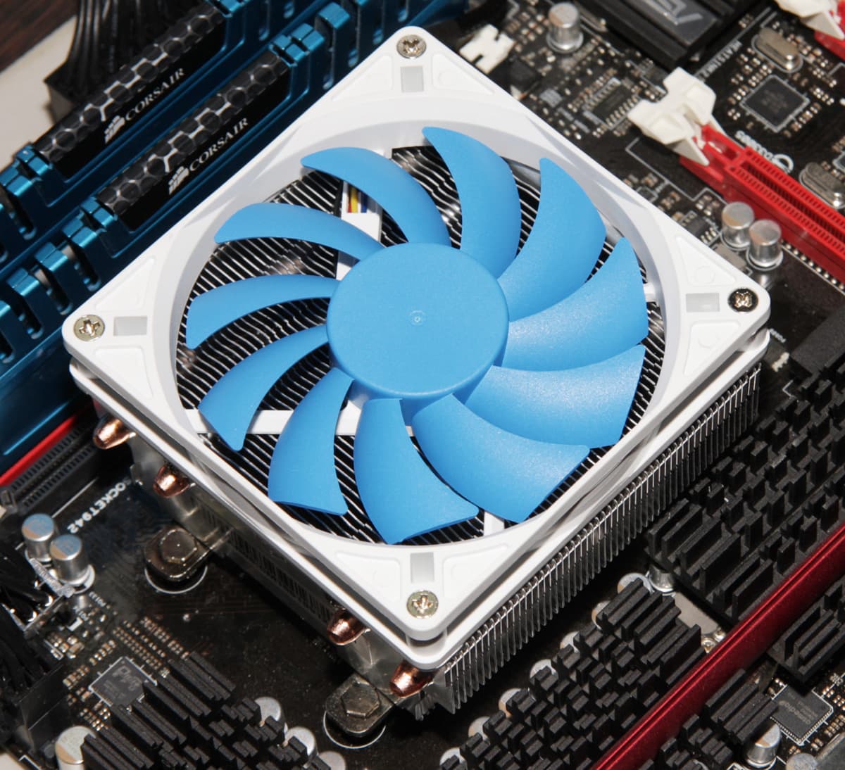 Кулер компактный, невысокий, в случае использованной в тестах мат. платы он не мешает установке модулей памяти с высокими радиаторами и не задевает радиаторы на VRM.