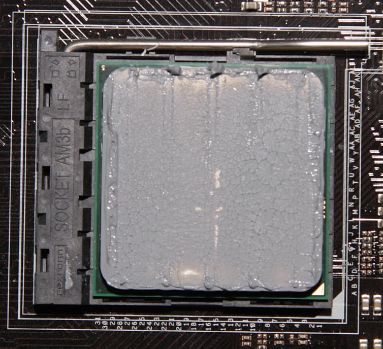 Преднанесенного термоинтерфейса нет, но производитель приложил к кулеру небольшой шприц с термопастой. Для заведомо хорошего распределения мы нанесли чуть избыточный слой термопасты, при более экономном расходе приложенного запаса должно хватить как минимум раза на два. Забегая вперед, продемонстрируем распределение термопасты после завершения всех тестов. На процессоре: