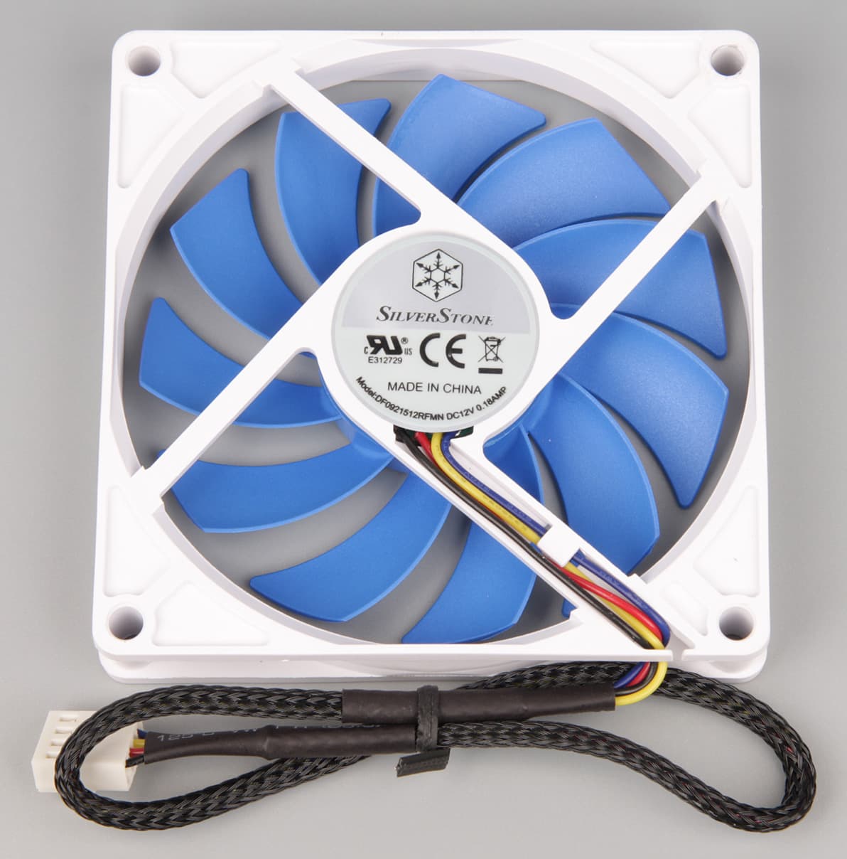 Габариты вентилятора практически совпадают с рабочей плоскостью радиатора. Типоразмер комплектного вентилятора 92 мм. Высота рамки 15 мм. Вентилятор винтами прикручен к двум кронштейнам, которые в свою очередь через упругие виброизолирующие втулки прикручены к радиатору. Маркировка на вентиляторе позволяет определить, что используется модель DF0921512RFMN.