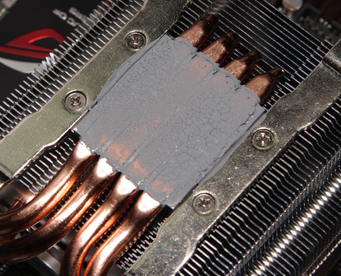 Видно, что термопаста распределилась до краев плоскости крышки процессора, при этом слой термопасты гораздо тоньше там, где термотрубки подходят к краю крышки процессора. Тщательное изучение подошвы показало, что она имеет незначительный прогиб в центре вдоль термотрубок. В данном случае с термопастой сложно переборщить, так как ее избытки выдавливаются в канавки между термотрубками и за плоскость подошвы. Отметим, что свежая и после тестов данная термопаста не слишком густая и не слишком жидкая — как раз той консистенции, когда ее удобно наносить и она равномерно распределяется по поверхности соприкосновения при установке кулера и затяжке креплений.