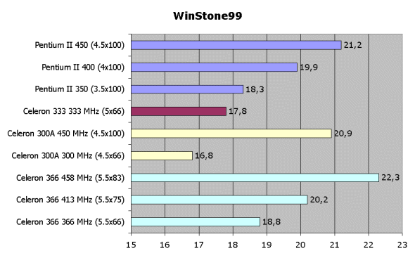 Особой разгоняемостью новый Celeron 366 меня не порадовал. Все, что смогут наверняка сделать его обладатели, ограничится поднятием частоты FSB до 75 МГц и установкой на процессоре частоты 413 МГц. Уже при 83 МГц на шине у процесоора наблюдается нестабильная работа и зависания. WinStone99 удалось прогнать полностью на этой частоте только при дополнительном охлаждении. На этом все возможности по разгону заканчиваются, так как по уже сложившейся традиции, коэффициент умножения у процессора зафиксирован и нет никаких возможностей его обойти.