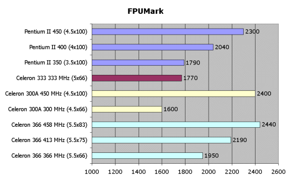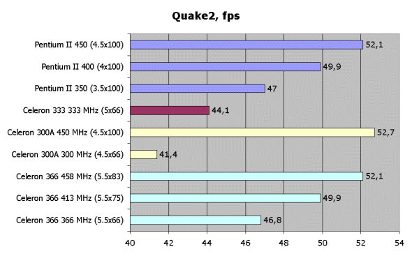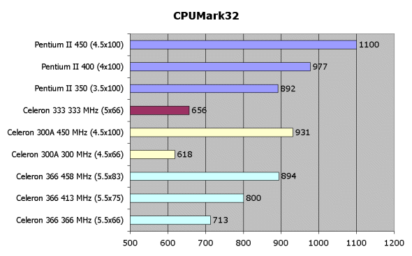 Ничего неожиданного на графиках выше не видно. Celeron 366, несмотря на то, что выглядит совсем по-другому, работает также, как бы и работал его слотовый собрат, то есть слегка побыстрее, чем Celeron 333. То есть никаких изменений в архитектуре не произошло. Собственно, никто и не обещал.