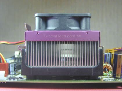 Еще один инсталляционный плюс кулера предустановленный «серебряный» термоинтерфейс (с 5%-ным содержанием оксида серебра), обладающий достойными физико-химическими свойствами и неплохой эффективностью. На сегодняшний момент это стандартная «фича» всех продуктов GlacialTech для Socket A и Socket 478.