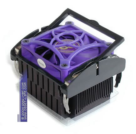 Еще один представитель нового семейства кулеров Spire для Socket 478 CoolGate, тоже отличается неординарным конструктивным исполнением: его «рабочее тело» сдобрено двумя медными тепловыми трубками диаметра 4 мм и составлено из двух блоков теплосъемного и теплоотдающего, роль которых играют алюминиевые радиаторы 74х45х35 мм с неплохими параметрами оребрения (толщина ребра 0,6 мм, общая площадь поверхности теплообмена около 1800 см2). А вентилятор типоразмера 70х70х15 мм (модель Fanner Tech FD07015B1H) крепится с торца всей этой комбинированной конструкции. Не лишен кулер и дополнительного внешнего лоска: подошва радиатора демонстрирует электрохимическую полировку отменного качества.