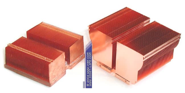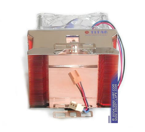 Другой новичок TTC-CU9TB/SC, претендующий на звание высокоуровневой системы охлаждения, на первый беглый взгляд смотрится весьма и весьма примечательным продуктом: кулер базируется на медном радиаторе 82Х63х37 мм (подошва 45х63 мм) с продвинутым оребрением (толщина ребра 0,1 мм, площадь поверхности теплообмена около 2000 см2), оснащен высокооборотистым вентилятором типоразмера 70х70х25 мм и сдобрен шестиконтакным крепежом.