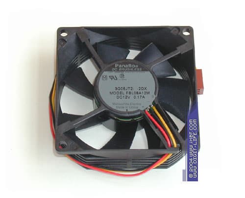 Довольно интересен и другой основной ингредиент вентилятор (модель Panaflo FBL08A12M от Matsushita Electric, сиречь Panasonic), отличающийся занятным аэродинамическим исполнением агрессивной конфигурацией лопастей крыльчатки и «решеточной» конструкцией патрубка. Такое инженерное решение позволяет достичь хорошо сбалансированных аэродинамических и акустических характеристик: оптимизированная крыльчатка «генерирует» усиленный продув, а решетка патрубка выступает в качестве вторичного воздухозабора, еще больше увеличивая воздушный поток и снижая интенсивность структурных вибраций, характерных для типической «монолитной» конструкции вентиляторного корпуса. Положительное влияние оказывает также и фирменный подшипник Hydro Wave (по сути, это серьезно улучшенная модификация подшипника скольжения), который призван уменьшить механические шумы вентилятора.