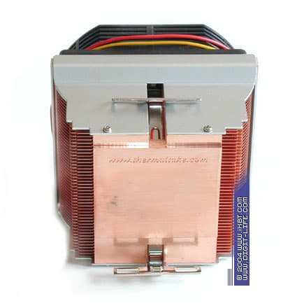 TTC-D9TB/CU35/R1, будучи представителем бюджетного «среднего класса», свое идейное вдохновение черпает в недрах продуктов известной серии D5T, развивая и дополняя конструктивную оснастку модели TTC-D5TB/G/CU35. Обновленный кулер базируется на расширенном радиаторе 80х80х40 мм (подошва 80х60 мм) с улучшенной конфигурацией оребрения (ребро трапецеидального сечения, толщина 0,8 мм в основании и 0,4 мм у вершины), сдобрен медным диском диаметра 35 мм, запрессованным в подошву, приправлен симпатичным вентилятором 80х80х35 мм со скоростью вращения крыльчатки 2300 об/мин и укомплектован шестиконтакным крепежом.