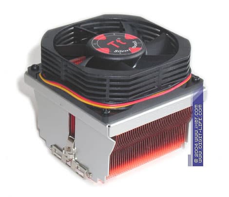 Следующим пунктом в нашем меню фигурирует свеженький деликатес Silent Boost, продукт кулинарных рецептов от компании Thermaltake. Кулер этот, надо отметить, выглядит весьма и весьма привлекательно: внушительный медный радиатор 80х65х47 мм (подошва 50х65 мм), занимательный вентилятор типоразмера 80х80х25 мм со скоростью вращения крыльчатки 2500 об/мин и нормативный шестиконтактный крепеж выдают увесистую порцию позитива.