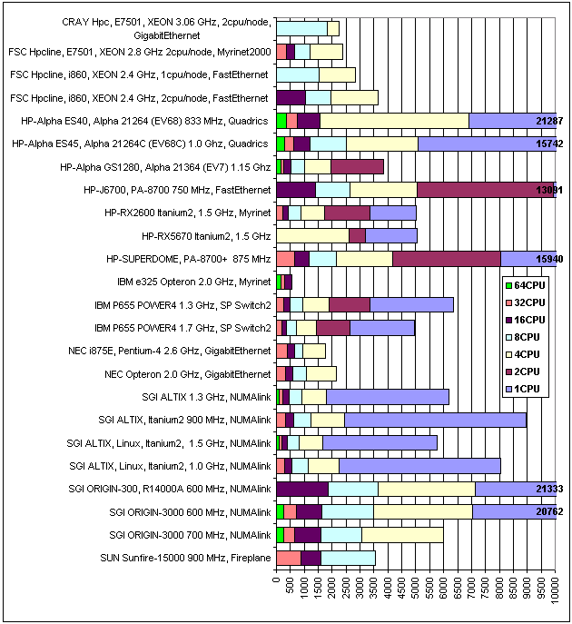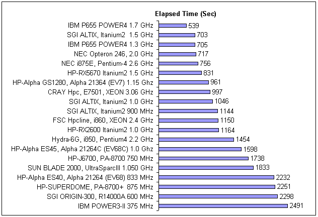 Тестирование систем, в однопроцессорной конфигурации, подтвердило лидерство «топовых» 64-разрядных решений от IBM и Intel, на процессорах Power4+ и Itanium2. Хотя Itanium2 лидирует в тестах SPEC, при решении задач в рассматриваемом программном пакете, наблюдается его отставание от Power4+, здесь сказывается огромный размер кэш памяти у процессоров от IBM. Возможно, с появлением процессоров Itanium2 c увеличенным размером кэш памяти третьего уровня до девяти мегабайт ситуация изменится в его пользу. Хорошие результаты показал процессор Alpha 21364. К сожалению, после слияния HP и Compaq ожидать бурного развития линейки этих процессоров не приходится. 64-разрядные процессоры других производителей сильно отстают от лидеров. Как известно, HP и SGI давно смотрят в сторону IA64 и, похоже, решили оставить собственные разработки. Компания Sun, похоже, решила обратить свои взгляды на процессоры Opteron от AMD.