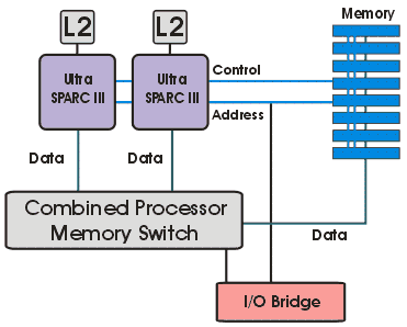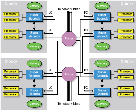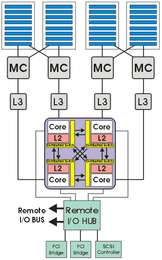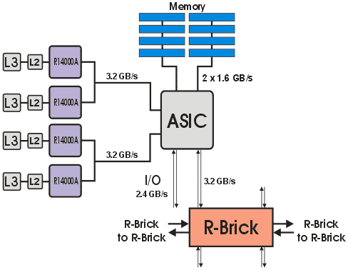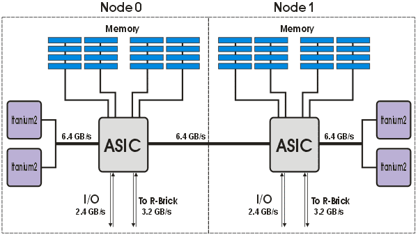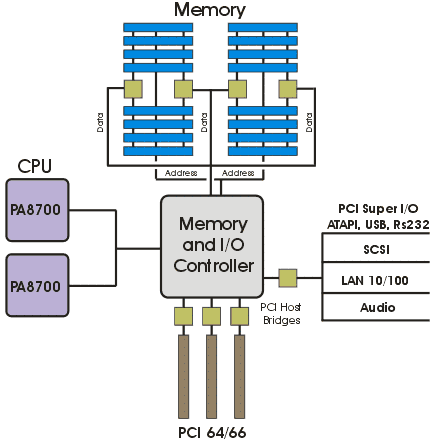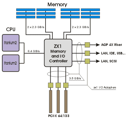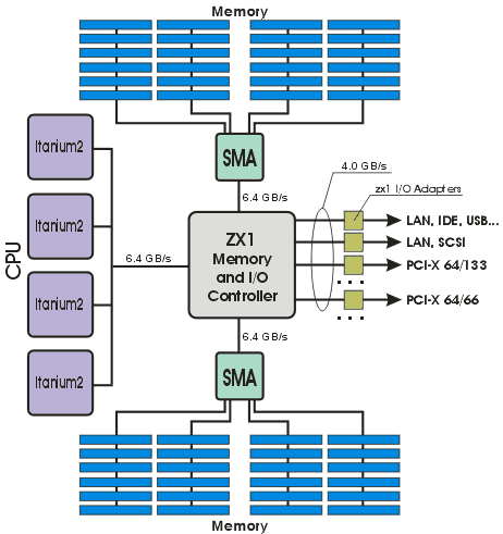 Сервер HP rx5670, построен на базе чипсета собственной разработки zx1. В данном случае, чипсет представлен следующим набором логики: микросхема MIO (Memory and Input/Output Controller), включающая в себя контроллер процессорной шины, два контроллера памяти и контроллер ввода-вывода, две микросхемы адаптеры расширения памяти SMA (Scalable Memory Adapter) и набор микросхем адаптеров ввода-вывода. Блок-диаграмма чипсета zx1, в четырехпроцессорной конфигурации, представлена на рис. 5. Более подробную информацию о чипсете можно узнать по этой ссылке на сайте HP.