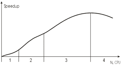 Рис.57. Общая картина масштабируемости систем.Зона 1 это прирост скорости вычислений, в рамках одного расчетного узла.