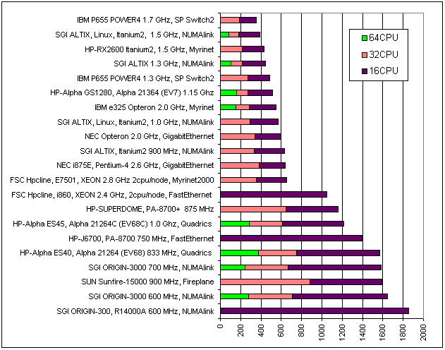 Рис.56. В другом масштабе, для наглядности.На рис. 56 системы отсортированы по времени выполнения задачи для 16 процессоров. Вышеприведенное утверждение насчет влияния межузлового интерфейса на производительность систем, может проиллюстрировать перераспределение «призовых мест», с увеличением задействованных в решении процессоров.