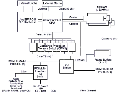 Пропускная способность шины данных порта UPA 83,3MHz*16byte=1.333Gb/s, а памяти (общей для обоих процессоров и шины ввода/вывода, обратите внимание(!) 83,3MHz*16byte=2.6Gb/s или 5,2Gb/s. Т.о., как сказано выше пропускная способность памяти этих систем достаточна (и, даже, несколько избыточна) для нормальной работы двух процессоров и систем ввода/вывода с максимально возможной скоростью.