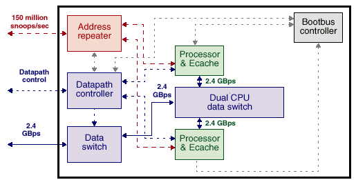 Свою роль сыграло и то, что пропускная способность применяемой системной шины несильно уступает пропускной способности шины FirePlane и значительно превосходит таковую у GigaPlane эта шина имеет ширину 256 разрядов (против 512 у FirePlane) и частоту 225MHz против 150. Соответственно, ее пропускная способность составляет 7200 Mb/s на канал, что для архитектуры серверов серии 2000, весьма похожих на Enterprise 10000 дает (128 процессоров в 32 четырехпроцессорных платах) дает совокупную пропускную способность несколько даже превосходящую таковую у SUN Fire 15k.