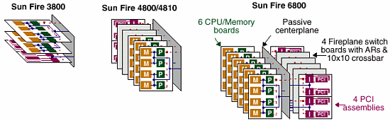 Описанные выше системные платы (до 16) объединяются с помощью фирменной технологии Gigaplane-XB. Соответственно, число процессоров в системе может быть от 1 до 64 (16 плат по 4 процессора).