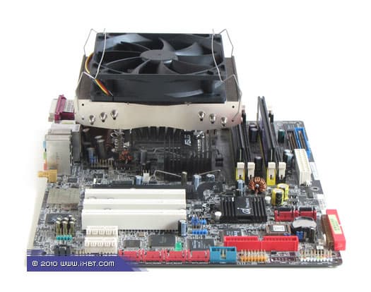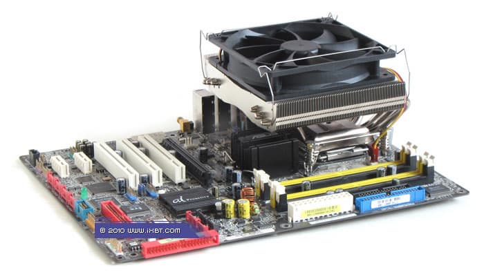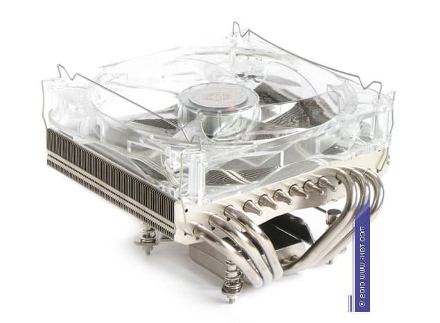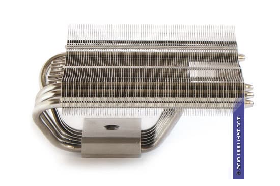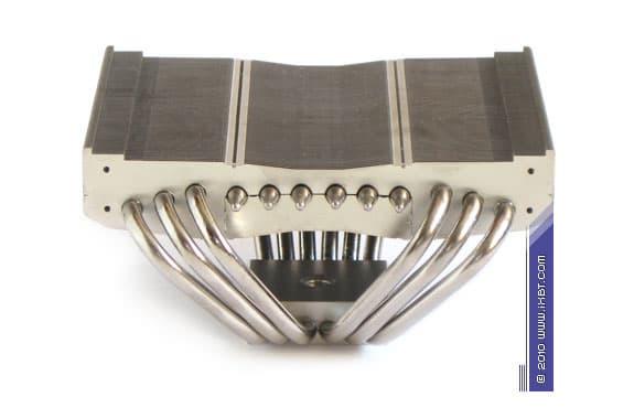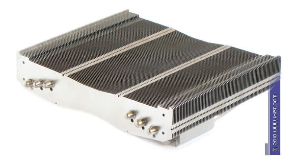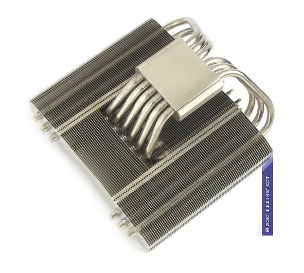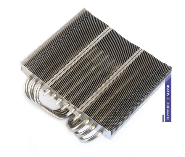 Конструктивные особенности (радиатор). «Рабочее тело» кулера образовано комбинацией медно-алюминиевого теплосъемника 50х40х14 мм, шести медных тепловых трубок диаметра 6 мм и двухкомпонентной секции алюминиевого оребрения (79 «внешних» широких пластин, 42 пластины во внутренней «вставке», общая площадь поверхности теплообмена порядка 5000 см2).