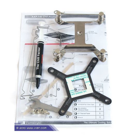 Поставка включает радиатор, набор крепежа для платформы Intel LGA775, фирменную термопасту Chill Factor, крепежные скобки и силиконовые прокладки для опционального вентилятора, а также краткое техническое руководство. Варианты крепежа для платформ Intel LGA1156/LGA1366 и AMD Socket AM2/AM3 предлагаются в виде отдельных продуктов.