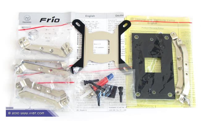Эксплуатационная эргономика. Продукт оснащен типовым инсталляционным комплексом, характерным для последних модельных серий Thermaltake — и на платформах Intel, и в системах AMD радиатор монтируется с помощью специализированных крепежных планок и пластин-супинаторов, при этом сам крепеж фиксируется гайками с обратной стороны материнской платы. В целом, процесс установки Frio довольно удобен и не требует каких-то сверхъестественных манипуляций (что нередко случается с другими хай-эндовыми кулерами). Однако начинающие пользователи все-таки могут столкнуться с некоторыми затруднениями, особенно в системах AMD, где дополнительно понадобится демонтировать стандартную рамку сокета, чтобы установить комплектную пластину-супинатор.