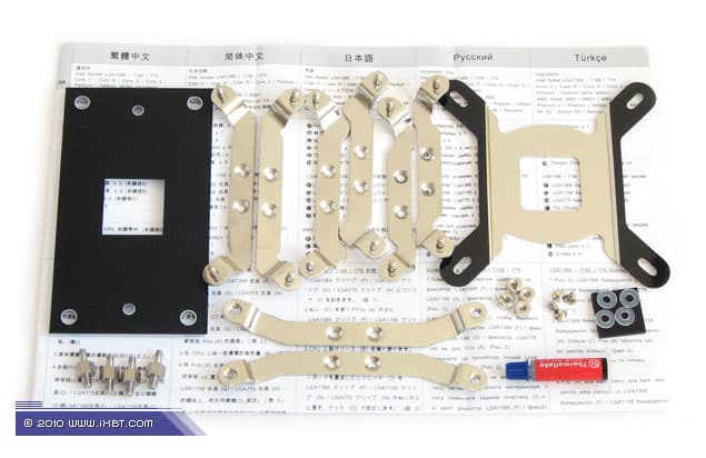 Поставка включает радиатор, два фирменных вентилятора (предустановленны на специализированных фиксирующих рамках), набор мультплатформенного крепежа (поддерживаются все актуальные платформы — Intel LGA775/LGA1156/LGA1366 и Socket AM2/AM3), небольшой шприц с термопастой, краткое техническое руководство и гарантийную карточку.