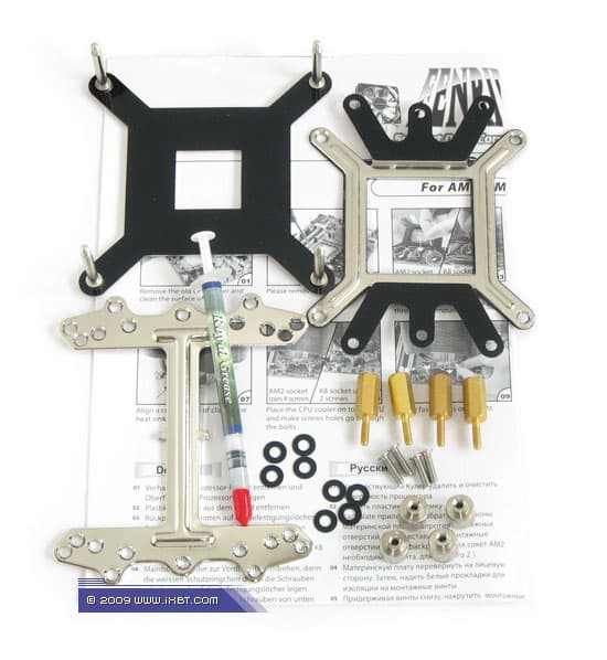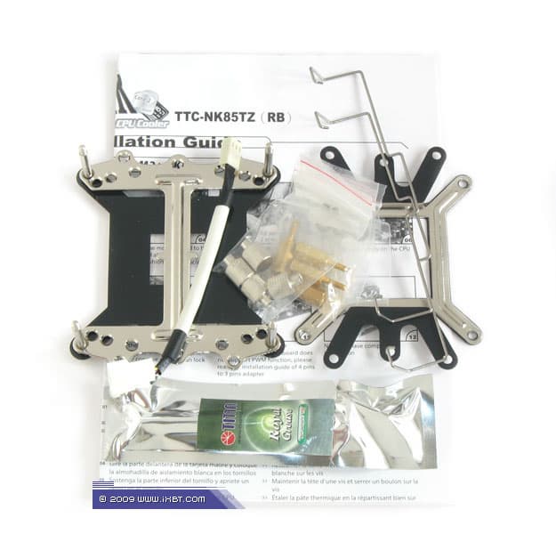Поставка включает радиатор, фирменный вентилятор, набор мультплатформенного крепежа (поддерживаются платформы Intel LGA775, LGA1366 и AMD Socket 754/939/AM2), шприц с термопастой, переходник электропитания и крепежные клипсы для вентилятора, техническое руководство (присутствует русскоязычная инструкция).