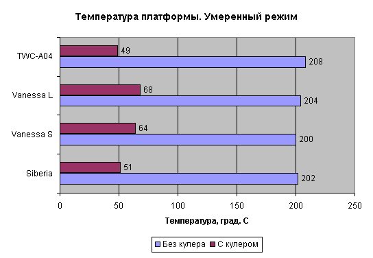 Получается палка о двух концах. Снижаешь скорость вращения вентилятора (одновременно и скорость охлаждающего воздуха), уменьшается и уровень шума. Но при этом ухудшается и эффективность охлаждения. В этом случае надо выбирать некую золотую середину. В какой-то степени, компромисс достигается в модели TWC-A04. Здесь и шум невысок, и эффективность охлаждения, как следует из предыдущих графиков, ничуть не хуже, чем у кулера Siberia. Причем температура платформы при умеренном режиме определялась при работающем охлаждении графического процессора. То есть, в более жестких условиях.