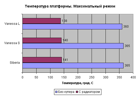А тепловые характеристики у кулера Siberia в наших опытах оказались лучше, чем у Vanessa S и L-type. И дело здесь вовсе не в том, насколько эффективны тепловые трубки. Судя по всему, свою непосредственную роль условного переноса поверхности съема тепла из точки А в точку В они выполняют неплохо. В ноутбуках они становятся уже незаменимыми, а в обычных персональных компьютерах места для радиатора пока, вроде бы, хватает. Но, по замыслу авторов, их применение в данных условиях позволяет существенно увеличить размеры радиатора и тем самым повысить теплосъем с процессора. Посмотрим, так ли это эффективно. На следующих рисунках представлены температуры платформы для наших моделей без включения их вентиляторов. То есть, оценивается работа только радиатора в условиях чисто естественно-конвективного отбора тепла.