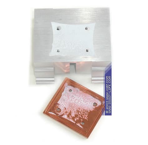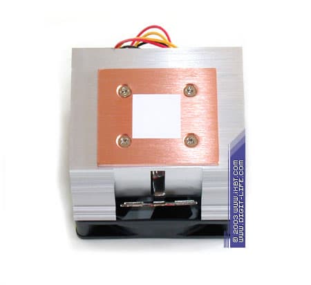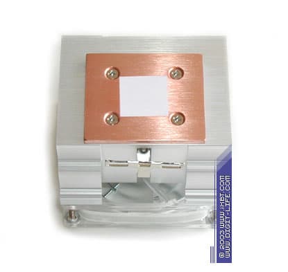 Но, к величайшему сожалению, практика показала совсем иное положение дел. Несмотря на комбинированную медно-алюминиевую конструкцию радиатора с развитым оребрением и не такой уж маломощный вентилятор со скоростью вращения крыльчатки 2600 об/мин, М1 продемонстрировал неожиданно слабую тепловую эффективность, всего лишь на уровне гораздо менее продвинутых в техническом плане кулеров Thermaltake Volcano 5 и Titan TTC-D5TB. Расследование по горячим следам выявило, что причиной такого нелицеприятного поведения стала тривиальная «экономия». Спецы TR2 просто «забыли» обеспечить надежный тепловой контакт в месте сочленения медной пластины и подошвы радиатора: если у Cooler Master CP5-6J31C сотоварищи соединение пластины и подошвы было крепко сдобрено термоклеем, то здесь пластина оказалась посаженной практически насухо, лишь с небольшим мазком термопасты.