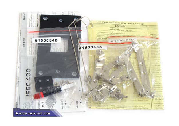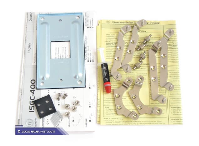 Поставка включает радиатор, фирменный вентилятор (ISGC Fan 12), набор мультплатформенного крепежа (поддерживаются платформы Intel LGA775, LGA1366 и AMD Socket AM2), фиксирующие скобки для вентилятора, маленький шприц с термопастой, техническое руководство (присутствует русскоязычная инструкция) и гарантийную карточку.