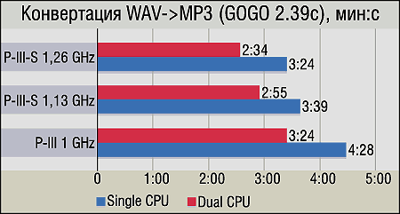 Буквально в предыдущем абзаце мы писали, что всевозможные "хитрые оптимизации" freeware-сообществом не очень любимы... но тем приятнее выглядят исключения из этого правила! Кодек GOGO-no-coda 2.39c сменил в нашей методике LAME именно по причине того, что он оптимизирован буквально "под все" — поддерживаются MMX, 3DNow!, SSE и даже многопроцессорные системы! Результаты несколько неоднозначны — в случае с одним процессором мы наблюдаем высокий "КПД большого кэша" (15%) и довольно малую зависимость производительности от частоты, но при переходе на SMP все происходит с точностью до наоборот. Предположения... перефразируя известное изречение — "чужой код — потемки". Однако "открытие" MP3-кодека, умеющего использовать многопроцессорность, стало для нас в любом случае приятным событием.
