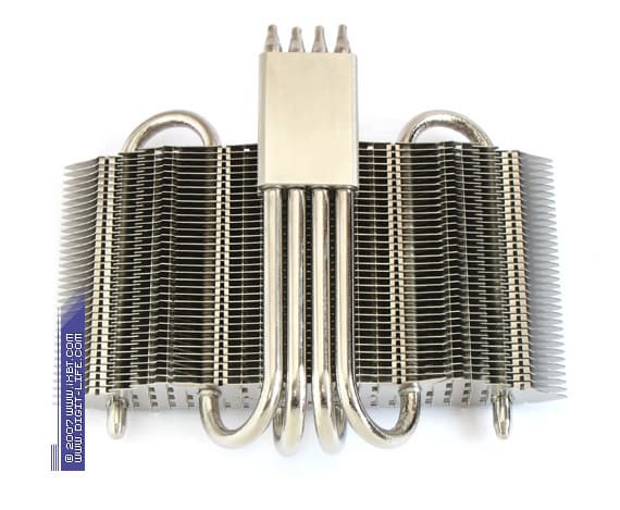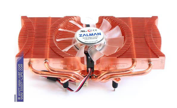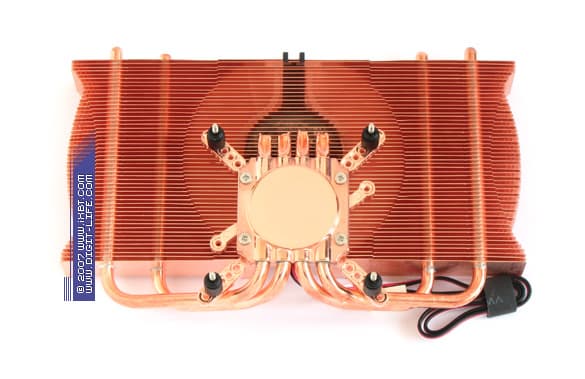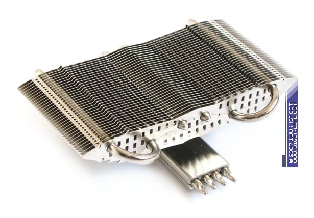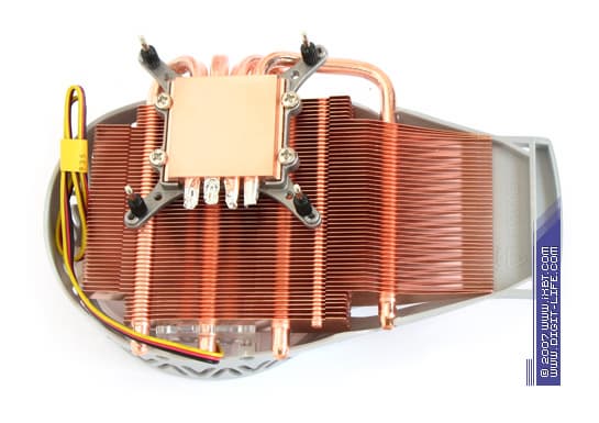 В конструктивном отношении HR-03 Rev.A больше похож на теплотрубные процессорные кулеры начального уровня, чем собственно на средства охлаждения видеокарт. Действительно, наш подопытный отличается весьма серьезным и крепко сбитым «торсом», нехарактерным для типовых видеокулеров имеем медный теплосъемник 30х45х10 мм, образованный двумя примыкающими пластинами «верхней» и «нижней», 4 медных тепловых трубки диаметра 6 мм и крупногабаритное алюминиевое оребрение в наборе 34 пластин с эффективными размерами 156х20 мм.