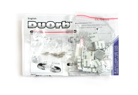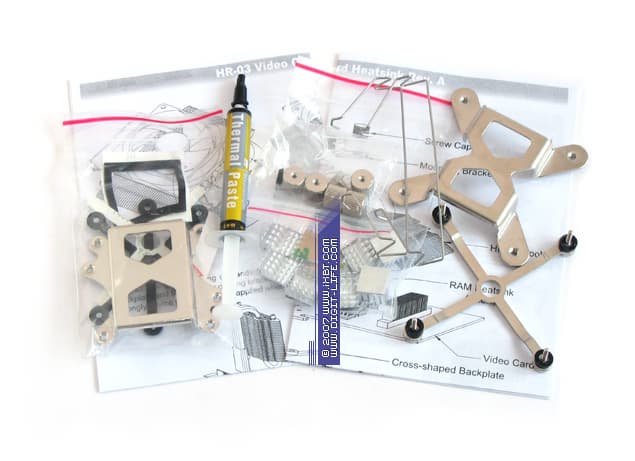 Хорош HR-03 Rev.A также и в эксплуатационном обиходе: наш подопытный снабжен вполне удобоваримым, универсальным крепежом, ориентированным под широкий спектр видеокарт от самых младших моделей (в том числе, морально устаревших, по типу GeForce 6600 и Radeon X1600), до среднеклассовых карт жанра GeForce 8800GT/GTS («официальная» поддержка новейших продуктов не заявлена, но практика свидетельствует об обратном). В комплекте также приложены тюбик термопасты, пара листов с кратким руководством по инсталляции, фиксаторы под вентилятор и наборчик радиаторов для чипов памяти (радиаторами на силовые элементы преобразователя питания карты придется отоварится уже самостоятельно).
