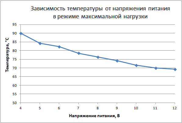 Управление кулером с помощью изменения напряжения питания позволяет получить более плавный график температуры, чем при использовании ШИМ-контроллера. При низком напряжении питания, из-за слишком низких оборотов вентилятора и небольшой площади рассеивания, данная модель кулера начинает испытывать трудности и склонность к перегреву.