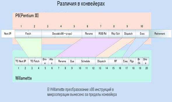 Во вторых, в действие вступает алгоритм предсказания переходов — чем длиннее конвейер, тем более важным становится предсказание того, выполнение какой инструкции понадобится, задолго до самого процесса ее выполнения. И, естественно, ошибка на этой стадии — выбор не той ветви, по которой пойдет процесс выполнения программы, будет весьма и весьма сказываться на производительности процессора. И она будет тем более критична, чем длиннее конвейер — одна ошибка в выборе исполняемых операций в самом начале, и пока досчитается весь конвейер, и выяснится, что считалось совсем не то… Intel пообещал в Willamette значительно повысить точность процесса предсказания переходов, "скомбинировав все доступные на сегодня схемы предсказаний". По некоторым сведениям, эффективность этого алгоритма в Willamette достигла 95 процентов.