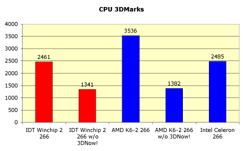 Прямо скажем, результаты не выдающиеся. Блок MMX у IDT Winchip 2 работает плохо. Правда, хорошим утешением для IDT может являться то, что приложений, использующих MMX-команды крайне мало и их число вряд ли вырастет сильно. MMX — это целочисленные SIMD инструкции, а разработчики гораздо охотнее используют арифметику с плавающей точкой, предоставляемую 3DNow!. Так что более интересен вопрос о качестве реализации в Winchip 2 технологии 3DNow!. Посмотрим, что говорит нам на этот счет CPU 3DMark: