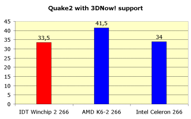Да, и здесь у IDT Winchip 2 не все так хорошо, как хотелось бы. Превосходство при включенном 3DNow! AMD K6-2 почти в полтора раза говорит о многом. В реальных же приложениях, которы е используют 3DNow!, например в Quake2, работающем через 3dfx OpenGL miniport результат получается такой: